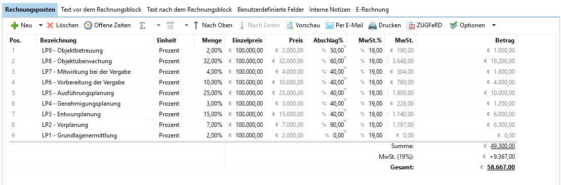 Die Prozent geben dabei an, welcher Teil des Gesamtbetrags der LP 1 in dieser Rechnung zu zahlen sind. In der nächsten Teilrechnung wird dieser Prozentsatz dann erhöht, bis er schließlich die 100% erreicht.