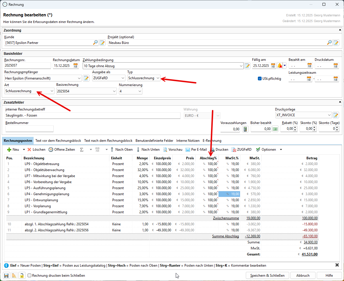 Denken Sie daran, wieder den Typ der Rechnung auf Teilrechnung und die Abschlagsrechnung - Basis für die erste Rechnung zu setzen.