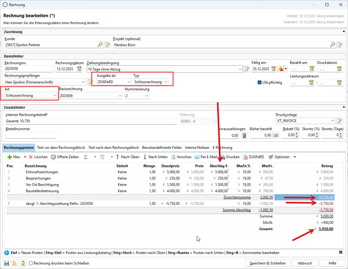 Wählen Sie jetzt wieder bei der ZUGFeRD Einstellung die Schlussrechnung und auch die Rechnungsart "Schlussrechnung". Die Abschlagbeträge geben Sie mit dem Vollpreis an, denn die erste Abschlagsrechnung wird dann in Abzug genommen: