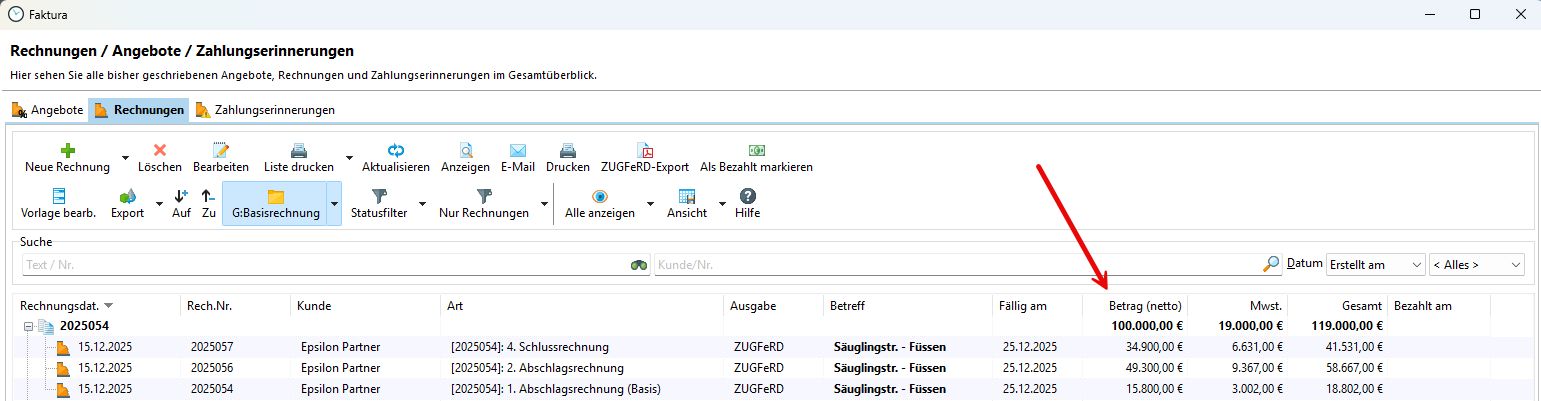 Füllen Sie die entsprechenden Felder der Rechnung und speichern diese ab. Sie ist nun als "Basisrechnung" in Ihrer Rechnungsliste gespeichert. Um eine gute Übersicht zu behalten, blenden Sie die Spalte "Art" in Ihrer Rechnungsübersicht ein und gruppieren nach "Basisrechnung".