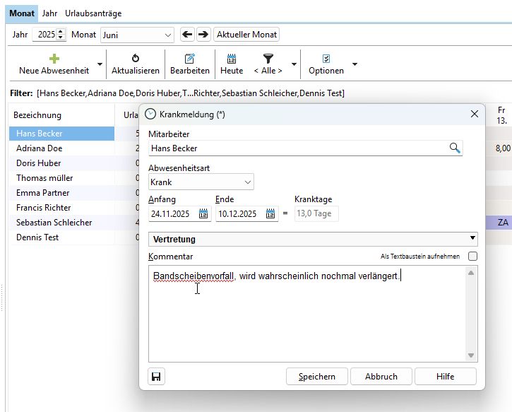 Über "Neue Abwesenheit" können Sie auch Datumsbereich zur Abwesenheit eintragen. Statt jeden einzelnen Tag mit der Maus anzuklicken, können Sie z.B. eine zweiwöchige Krankmeldung ganz einfach eingeben. Bei der Eintragung werden die Arbeitstage, wie im Arbeitszeitmodell angelegt, berücksichtigt.