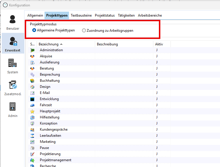 Dazu wählen Sie den Projekttypmodus in der Konfiguration -> Erweitert -> Projekttypen