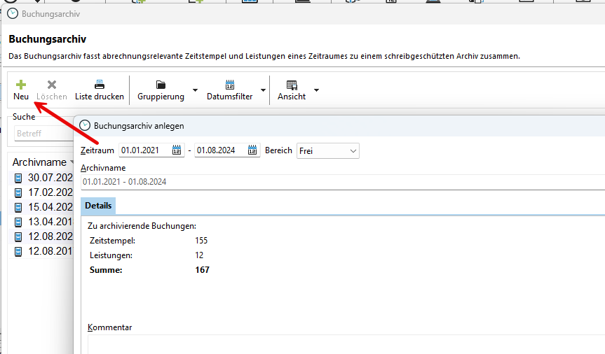 Das Buchungsarchiv fasst abrechnungsrelevante Zeitstempel und Leistungen eines bestimmten Zeitraums zu einem schreibgeschützten Archiv zusammen. Wenn Sie also über den Jahreswechsel bei Ihnen im Unternehmen die Preise ändern, dann können Sie die Preise der Zeitstempel des Vorjahres festschreiben. In der Auswertung können Sie dann über entsprechende Filter auf die archivierten Zeiten zugreifen und diese auswerten.