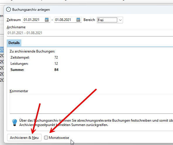 Möchten Sie monatsweise Archivieren geben Sie einen größeren Zeitraum ein und setzen den Haken bei "Monatsweise". Damit werden einzelne Buchungsarchive erzeugt. Auch die Funktion "Archivieren & Neu" vereinfacht die Erfassung, wenn Sie einzelne Buchungsarchive erstellen möchten.