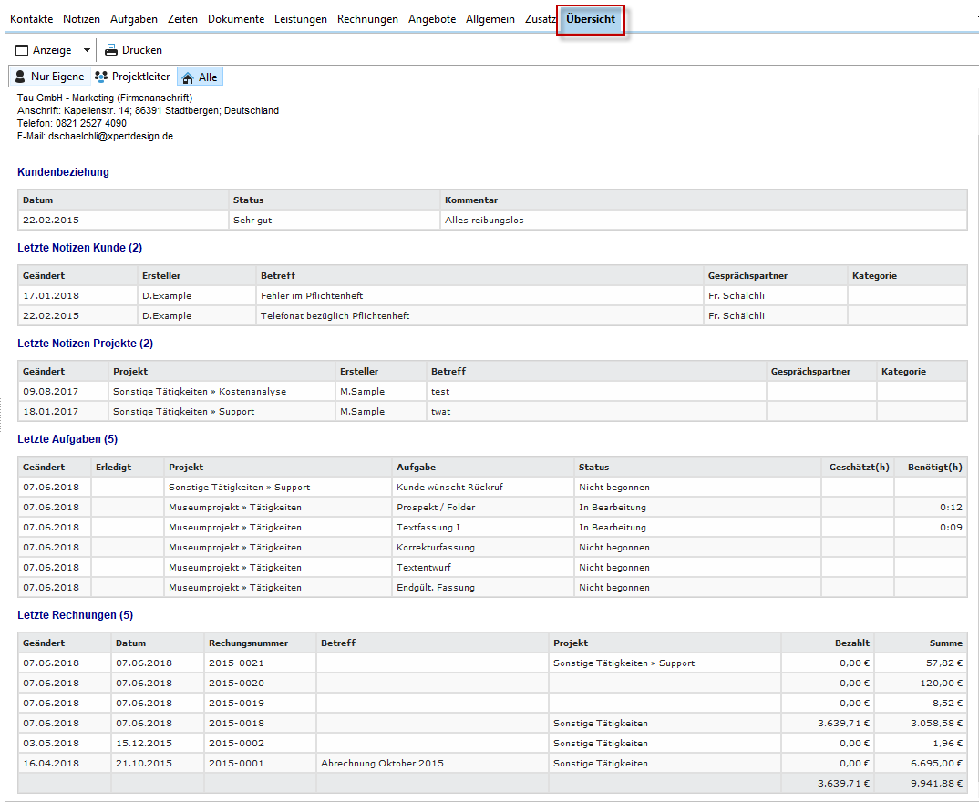 ➢ Adresse ➢ Kundenbeziehung ➢ Zusatzfelder ➢ Die letzten Notizen zum Kunden ➢ Die letzten Projekte, Aufgaben, Angebote und Rechnungen ➢ Die offenen Projekte, Aufgaben, Angebote und Rechnungen |