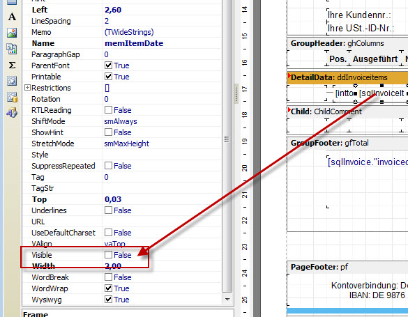 Die Daten selbst, also die SQL Befehle und Datenbänder sollten Sie so bestehen lassen wie sie sind. Wenn Sie ein Feld, z.B. sqlinvoice."discountpercentage" (Rabatt) löschen, erhalten Sie eine Fehlermeldung, da im Reiter "Code" genau dieses Feld noch angesprochen wird. Besser ist es, Sie setzen die Felder, die Sie nicht benötigen auf "Visible" -> False. Damit wird dieser Bereich nicht mehr angezeigt. Denken Sie auch daran in allen drei Zeilen den entsprechenden Bereich auf "Visible" -> False zu setzen, damit die Anordnung beim Rechnungsdruck wieder passt.