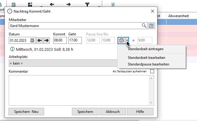 Es öffnet sich ein Nachtrag Dialog. Wenn Sie mehrere Zeiten mit den gleichen von/bis Daten eingeben müssen, können Sie den Knopf "Standardzeit" verwenden. Das erleichtert die Eingabe.