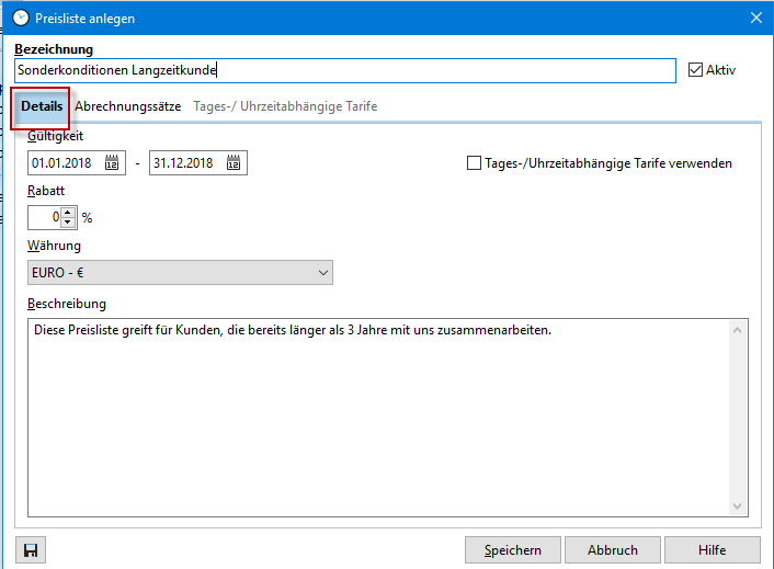 Haben Sie in Ihrer neuen Preisliste "Tages-/Uhrzeitabhängige Tarife verwenden" aktiviert, wird der entsprechende Reiter in dem Dialog aktiv und Sie können Eintragungen vornehmen.