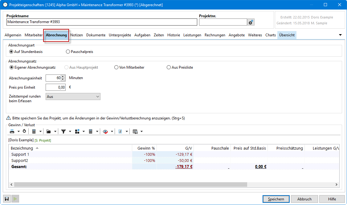 Summe Aufwand = Hinterlegter Stundensatz beim Mitarbeiter x Erfasste Zeiten