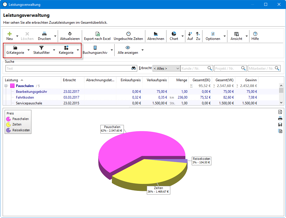 Die Leistungsverwaltung finden Sie im Projektmanager im Menüpunkt "Fenster" und der Auswahl "Leistungen / Kosten". Sie bietet Ihnen einen Überblick all Ihrer erfassten Leistungen. Hier können Sie nach einer bestimmten Leistung suchen, nach Kunden oder Projekt filtern und die Daten wie in den anderen Bereichen des Xpert-Timer gruppieren. Je nach Gruppierung wird Ihnen auch eine Grafik zu Ihren Leistungen angezeigt.