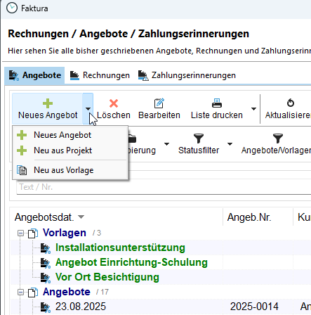 Per Klick auf das grüne Plus können Sie ein neues Angebot erstellen. Dabei haben Sie die Möglichkeit, eine komplett leere Angebotsvorlage zu nutzen oder ein Angebot aus einer bestehenden Projektstruktur zu erstellen.