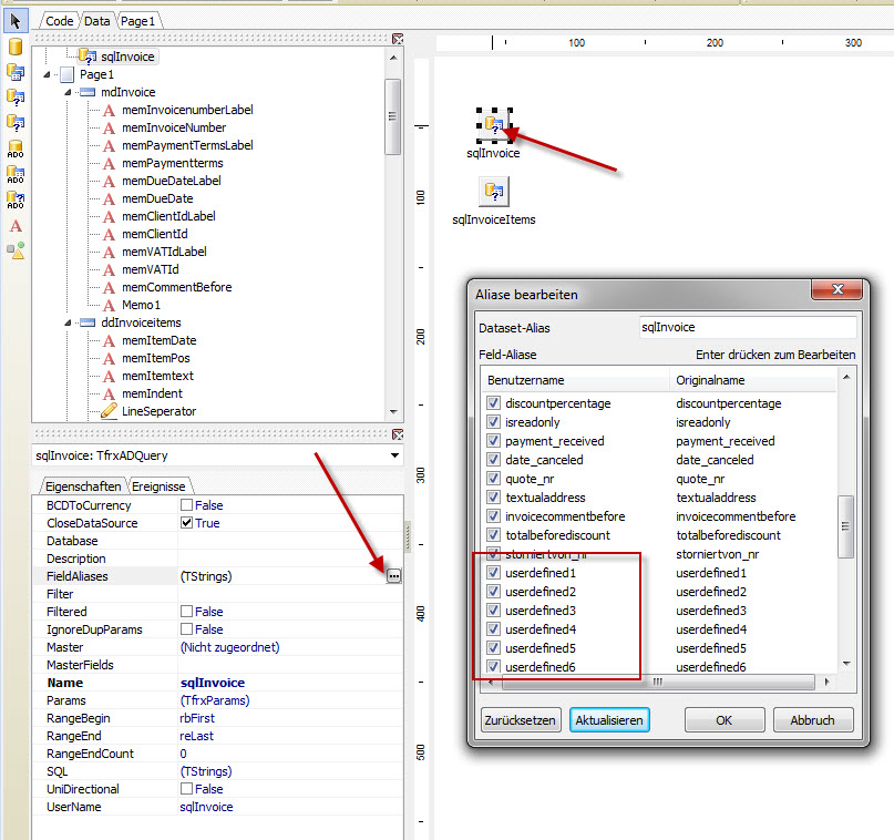 - Wechseln Sie auf den Reiter "Data". Dort steht Ihnen die SQL-Abfrage "sqlInvoice" zur Verfügung. Klicken Sie einfach auf diese Abfragebox, damit Sie die Eigenschaften der Box erhalten. Wenn Sie jetzt in den Eigenschaften auf das Feld "FieldAliases" klicken, dann sollten Sie die userdefined - Felder sehen. Falls nicht, klicken Sie auf "Aktualisieren". Erst wenn Ihre userdefined Felder hier gelistet werden, sind Sie auch im Report verfügbar.