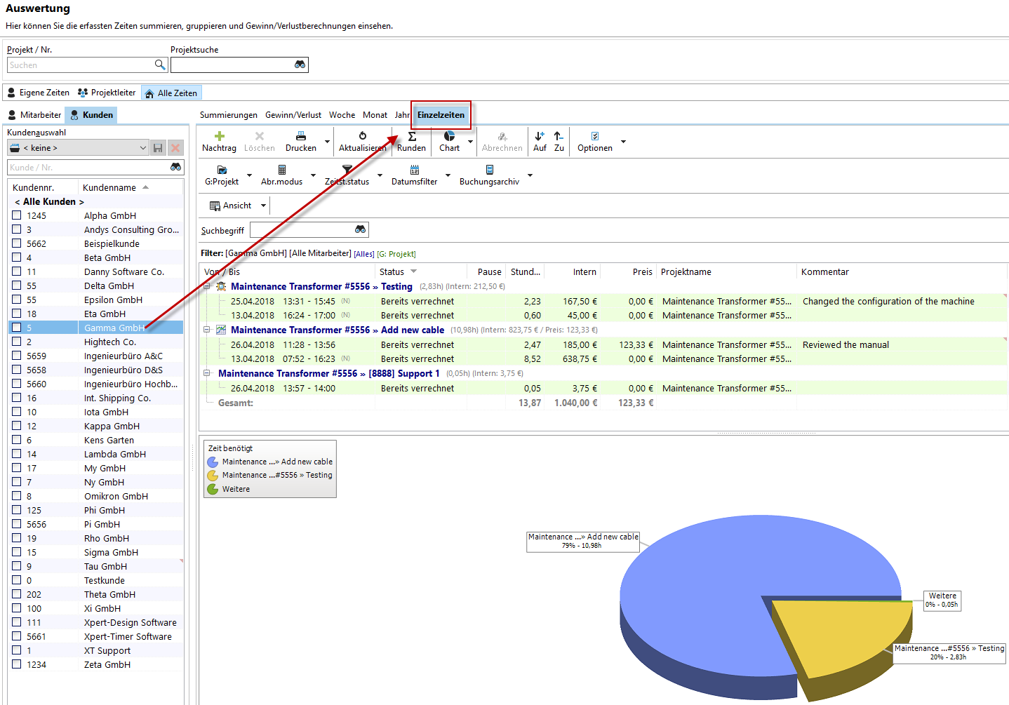 Der Reiter "Einzelzeiten" bietet Ihnen in der Auswertung die gleichen Funktionen wie die Zeitstempelliste in Ihrem Projektmanager.