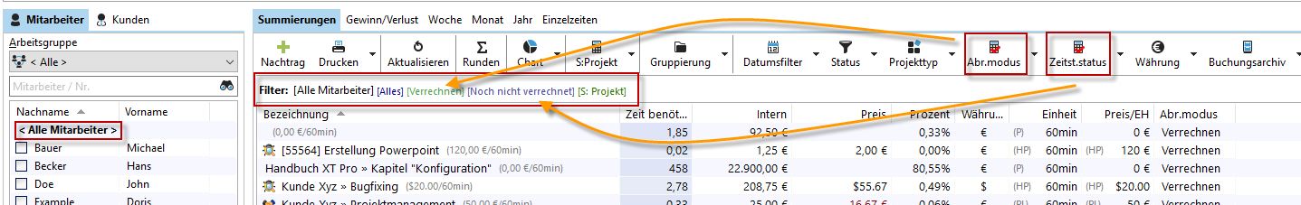 Um sämtliche noch nicht verrechnete Zeitstempel aller verrechenbaren Projekte zu sehen, wird kein Mitarbeiter ausgewählt. Die Filterung soll über "Alle Mitarbeiter" erfolgen. Der Filter des "Abrechnungsmodus" (Abr.modus) wird auf "verrechnen" gesetzt und bezieht sich auf den Abrechnungsmodus des Projekts. Zusätzlich wird der Filter des "Zeitstempelstatus" (Zeitst.status) auf "Nur 'noch nicht verrechnete'" gesetzt und bezieht sich explizit auf den einzelnen Zeitstempelmodus. Setzen Sie die "Summierungen" (S:Projekt) auf "Projekt", damit die Zeiten und Kosten pro Projekt angezeigt werden.