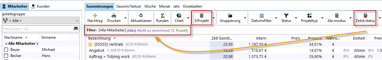 Im Projekt kann es vorkommen, dass Mitarbeiter Zeitstempel erfassen, aber entscheiden, dass diese erfasste Zeit dem Kunden nicht in Rechnung gestellt werden sollte. In dem Fall wird der Zeitstempelstatus vom Mitarbeiter auf "nicht zu verrechnen" gesetzt. Um zu filtern, ob und warum solche Zeitstempel erfasst wurden, setzen Sie den Filter des Zeitstempelstatus (Zeitst.status) auf "Nur 'nicht zu verrechnende'" und die Summierung auf "Projekt".