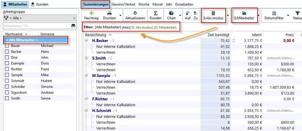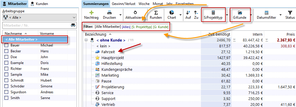 Wählen Sie <Alle Mitarbeiter>, um die Liste über alle Mitarbeiter zu generieren. Dann setzen Sie die Summierung auf Projekt und die Gruppierung auf Mitarbeiter, oder umgekehrt. Zusätzlich können Sie noch einen Datumsfilter setzen.