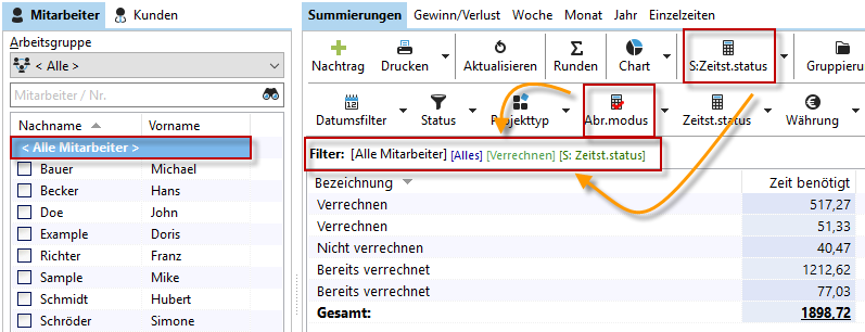 Einen Überblick über die Projektzeiten, die in die unterschiedlichen Projektabrechnungsmodi fließen, erhalten Sie, wenn Sie die Summierung auf "Abrechnungsmodus" setzen. Im Beispiel haben wir über alle Mitarbeiter gefiltert.