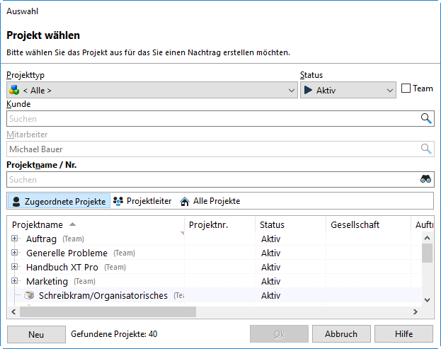 In manchen Dialogen haben Sie die Möglichkeit über den Knopf "Suchen" ein Projekt auszuwählen.