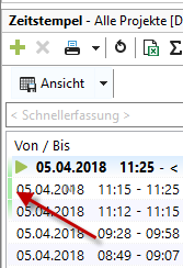 Die schmalen grünen Balken links vom Zeitstempel zeigen die Zusammenhänge von Endzeit des letzten Stempels und Start des neuen Stempels. Gibt es keine Lücken in den Zeitstempelungen, dann erscheint ein durchgehender grüner Balken. Sind Lücken vorhanden, dann ist kein grüner Balken neben dem Zeitstempel zu sehen.