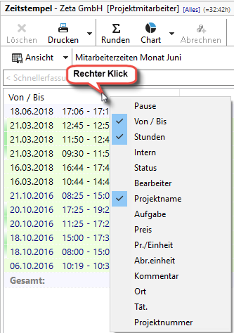 Mit einem Rechtsklick in den Menübereich der Zeitstempelliste sowie der Aufgabenliste und den Leistungen, können Sie wählen, ob Sie die gespeicherten Ansichten angezeigt bekommen möchten.