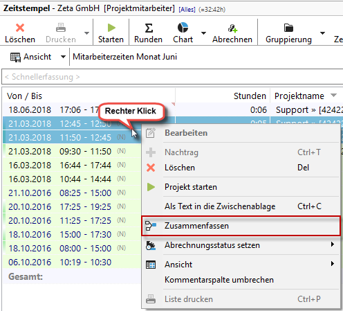 Hängen viele Ihrer Zeitstempel zusammen, wurden jedoch als einzelne Stempelungen erfasst, können Sie die Zeitstempel zusammenfassen. Bitte beachten Sie, dass die entsprechend zugehörigen Projekte die gleichen sein müssen.