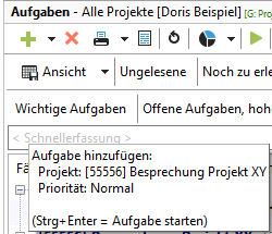 Im Projektmanager gibt es mehrere Möglichkeiten, neue Aufgaben anzulegen. Die schnellste Methode ist dabei die intelligente Schnellerfassung in Ihrem Aufgabenfenster.