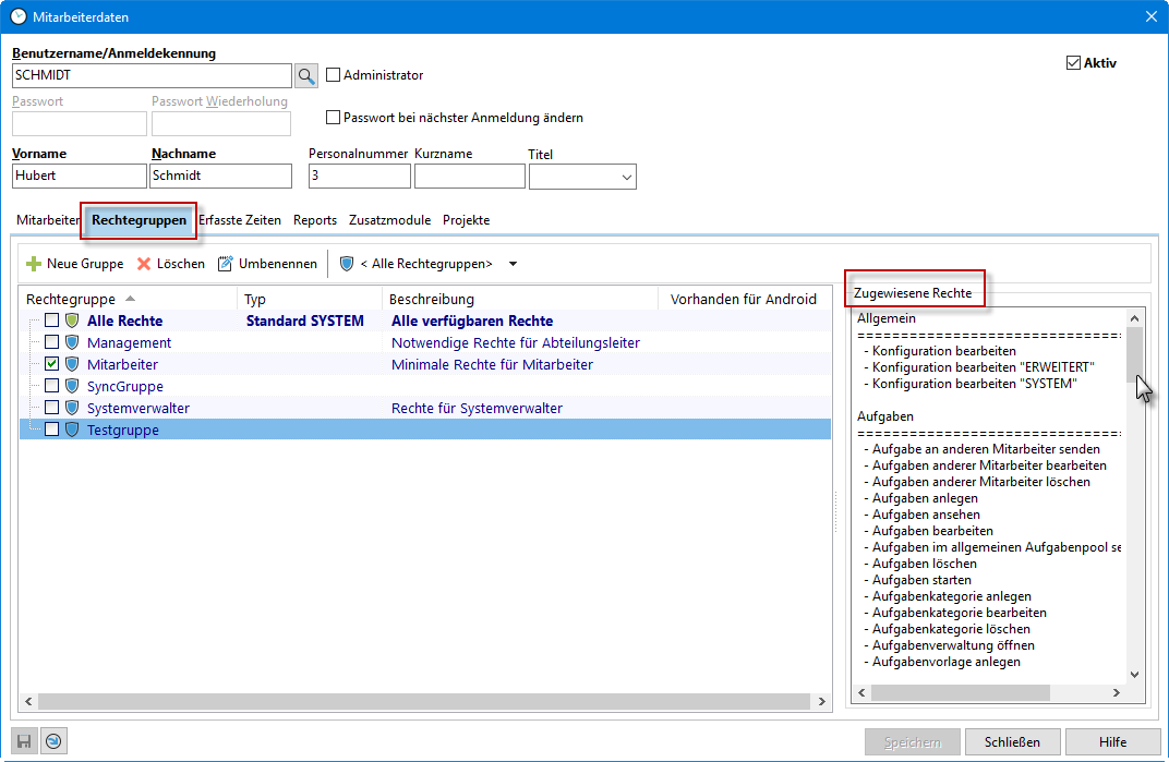 << Click to Display Table of Contents >> Navigation: Xpert-Timer Handbuch > Mitarbeiterverwaltung > Mitarbeiterdaten > Rechtegruppen |