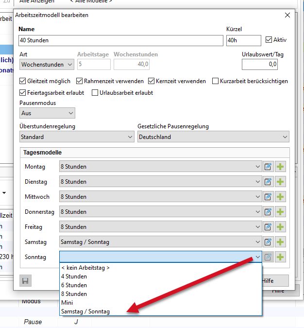 Wählen Sie dann im nächsten Schritt das neue Tagesmodell für Samstag und Sonntag aus. In diesem Beispiel heißt das Tagesmodell Samstag/Sonntag und hat 0 Stunden Sollzeit.