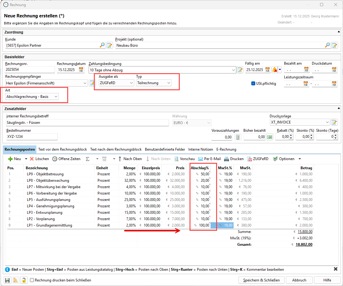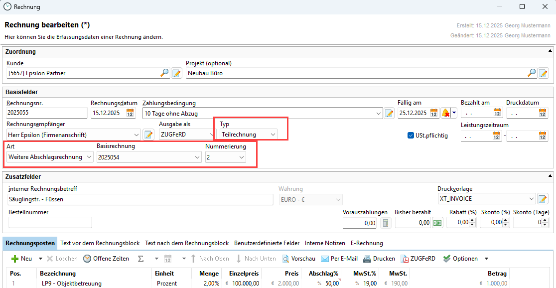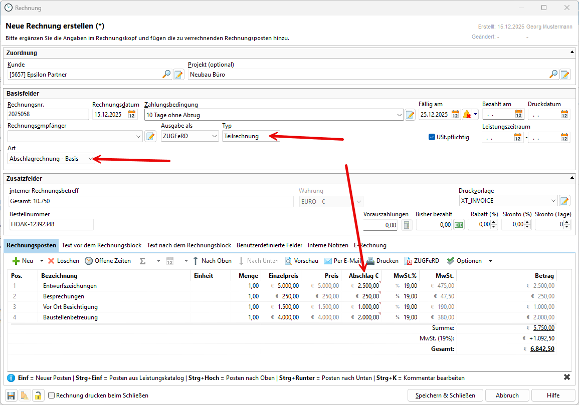 Denken Sie daran, wieder den Typ der Rechnung auf Teilrechnung und die Abschlagsrechnung - Basis für die erste Rechnung zu setzen.