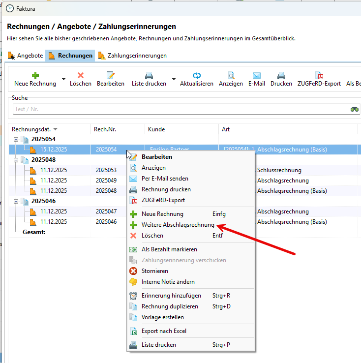 Um die nächste Abschlagsrechnung zu erstellen, klicken Sie mit der rechten Maustaste auf eine bestehende Rechnung. Wählen Sie dann "Weitere Abschlagsrechnung".