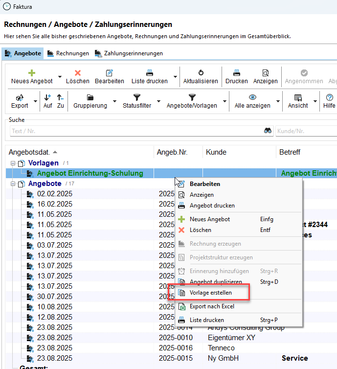 Zu Angeboten können wie bei den Rechnungen, Vorlagen erstellt werden. Der Ablauf dazu ist gleich. Um eine Vorlage zu erstellen, klicken Sie mit der rechten Maustaste in die Liste und wählen "Vorlage erstellen".
