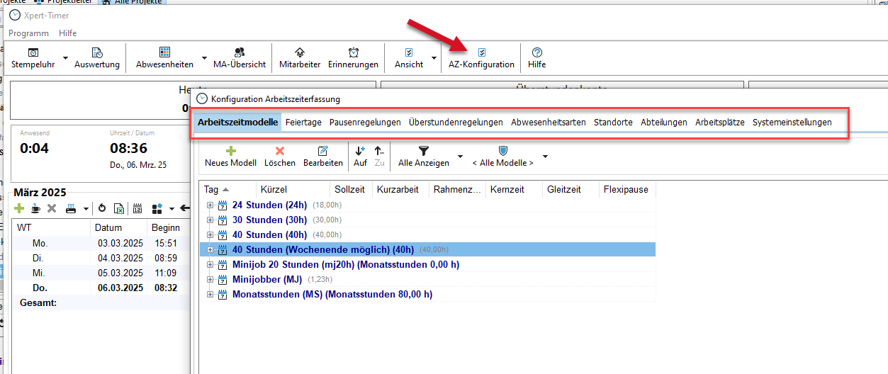 Zur Einstellung der Arbeitszeitmodelle, Feiertage, Pausenregelungen usw. nutzen Sie die AZ-Konfiguration.