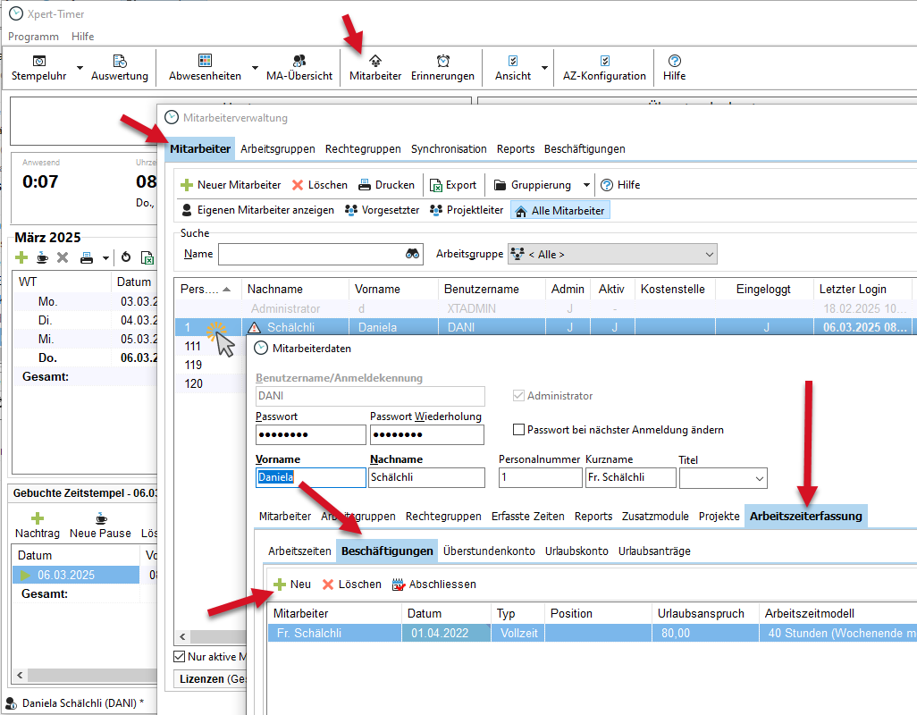 4.Nach Einrichtung der Konfiguration bearbeiten Sie die einzelnen Mitarbeiter und erstellen jeweils eine neue Beschäftigung mit einem Arbeitszeitmodell.