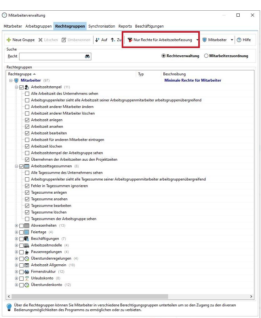6.Passen Sie die entsprechenden Rechte in der Rechtegruppe des Mitarbeiters. Filtern Sie der Übersichtlichkeit halber am besten nach "Nur Rechte für Arbeitszeiterfassung" und nehmen sich ein paar Minuten Zeit um die Rechte zu setzen.