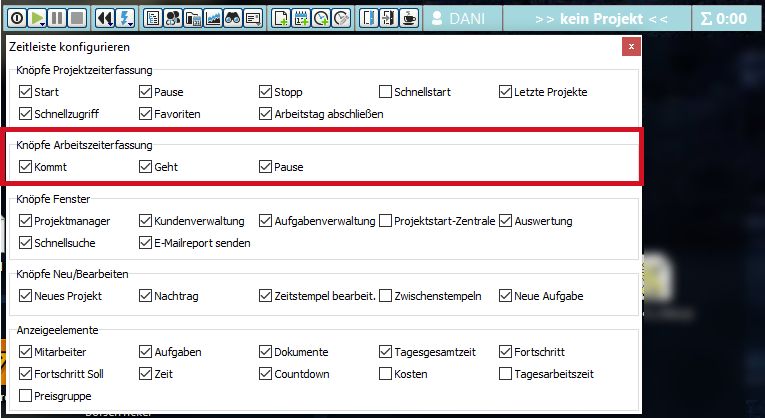 8.Auch in Ihrer Zeitleiste können Sie die Knöpfe für die Arbeitszeiterfassung einblenden. Ein rechtsklick auf die bereits eingeblendeten Knöpfe bietet die Möglichkeit unter den Anzeigeelementen die Arbeitszeit einzublenden..