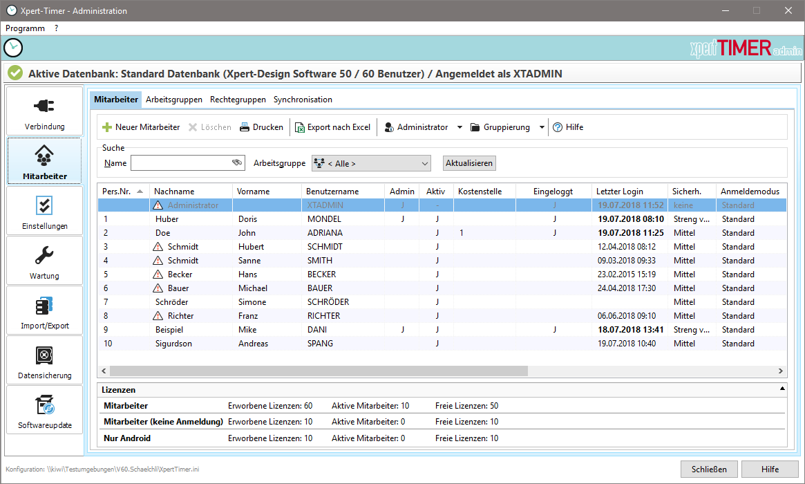 In diesem Menüpunkt sehen Sie Ihre am Xpert-Timer System angemeldeten bzw. angelegten Mitarbeiter. Hier können Sie auch neue Mitarbeiter für das Xpert-Timer System anlegen, bearbeiten oder löschen.