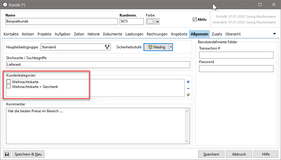 Im Reiter "Allgemein" des Kundendatensatzes können Sie dann die Kundenkategorie zuordnen.