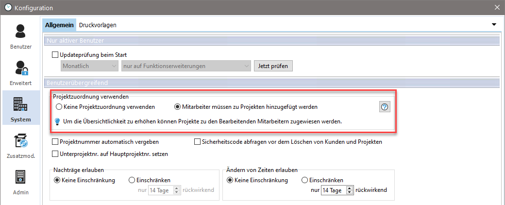 Den Modus können Sie in der Konfiguration umschalten. Bedenken Sie, dass Sie beim Umschalten auf "Mitarbeiter müssen zu Projekten hinzugefügt werden", die Projektzuordnung vornehmen müssen, damit die Mitarbeiter die Projekte sehen.