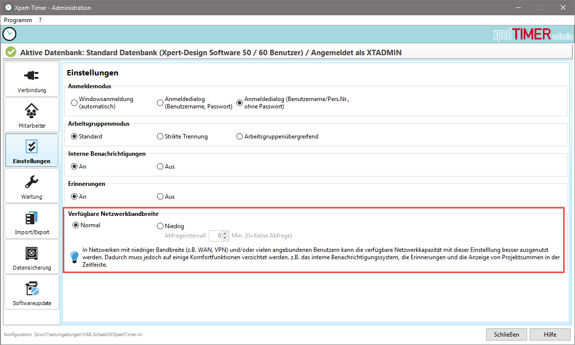 Wenn die Geschwindigkeit Ihres Netzwerks niedrig ist, z. B. bei Verwendung von VPN, kann es hilfreich sein, diese Option auf "Niedrig" zu setzen. Xpert-Timer wird dann die Benachrichtigungen und Nachrichten auf ein Minimum beschränken. Bitte stellen Sie auch den Abfrageintervall ein.