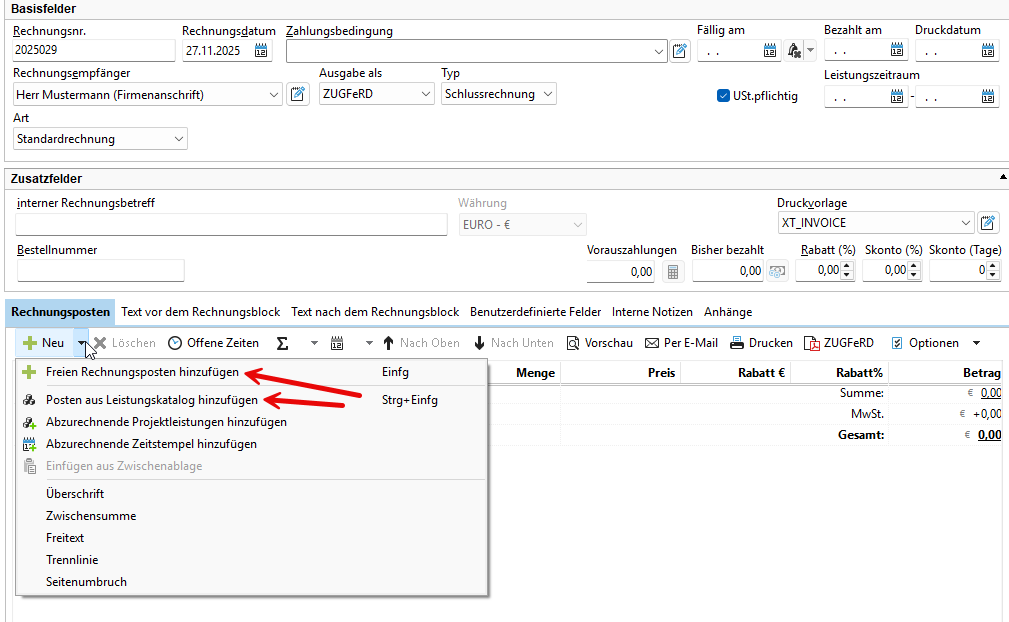 •Freien Rechnungsposten hinzufügen: Hier erfassen Sie freie Leistungen, wie z.B. Fahrkosten zu einem Projekt.