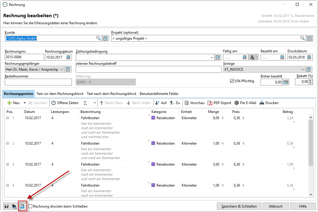 Im Dialog "Rechnung bearbeiten" können Sie die Erfassungsdaten einer Rechnung ändern. Achten Sie dabei auf das Symbol mit dem Schloss im unteren Bereich des Dialogs. Ist das Schloss geschlossen, ist die Rechnung schreibgeschützt und Sie müssen zunächst auf das Symbol klicken. Erst bei geöffnetem Schloss können Sie Änderungen vornehmen. Beachten Sie bei der Bearbeitung einer Rechnung bitte auch die weiter oben aufgeführten Hinweise, unter anderem zu manuellen Preisänderungen.