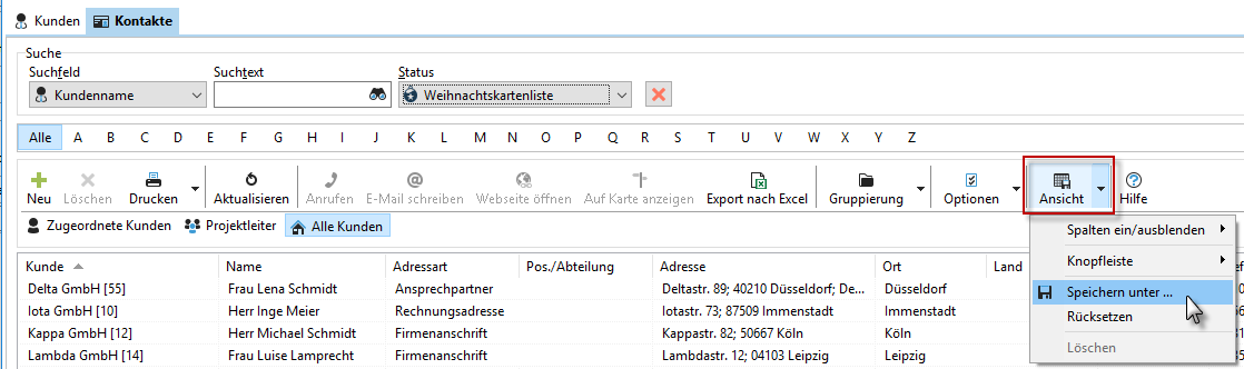 Die Kontaktliste bietet Ihnen verschiedenste Möglichkeiten Ihre Liste zu gruppieren und zu filtern. So können Sie z.B. eine Liste der Kontakte erstellen, die eine Weihnachtskarte erhalten sollen.