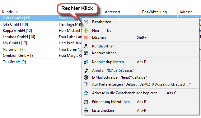 Im Kontextmenü stehen Ihnen viele weitere Funktionen zur Verfügung. So können Sie sich z.B. die Adresse des Kunden auf der Landkarte anzeigen lassen, direkt eine E-Mail schreiben oder den Kunden über die TAPI-Schnittstelle anrufen.