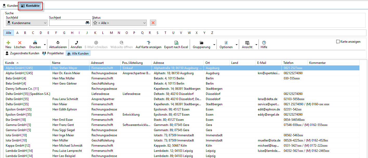 Möchten Sie die Kundenkontakte separat bearbeiten, können Sie diese direkt über den Reiter "Kontakte" im Listenformat anzeigen lassen: