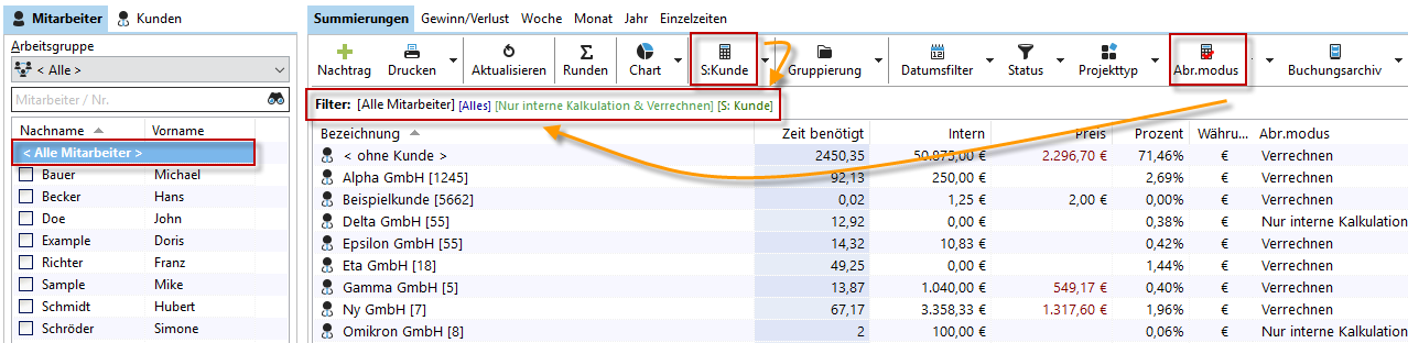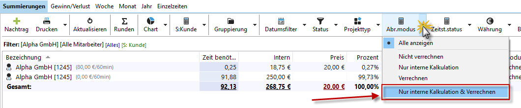 Setzen Sie also die Summierung auf "Kunde" und den Abrechnungsmodus auf "Nur interne Kalkulation & Verrechnen".