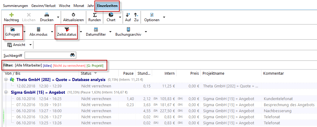 Um noch genauer zu recherchieren, um exakt welche Zeitstempel es sich handelt, wechseln Sie zum Reiter "Einzelzeiten". Auch hier setzen Sie den Filter des Zeitstempelstatus auf "Nur 'nicht zu verrechnende'". Gruppieren Sie nach "Projekt". Sie sehen dann, dass die Summe des Projekts mit den Zahlen der Summierung übereinstimmt. Zusätzlich können Sie jetzt noch die einzelnen Zeitstempel prüfen und über deren jeweils erfassten Kommentare entscheiden, ob die Mitarbeiter den Zeitstempelstatus wirklich korrekt gesetzt haben.