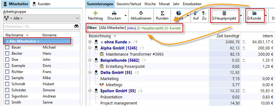 Wählen Sie <Alle Mitarbeiter>, um die Liste über alle Mitarbeiter zu generieren. Dann setzen Sie die Summierung auf Projekt und die Gruppierung auf Mitarbeiter, oder umgekehrt. Zusätzlich können Sie noch einen Datumsfilter setzen.