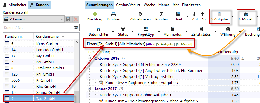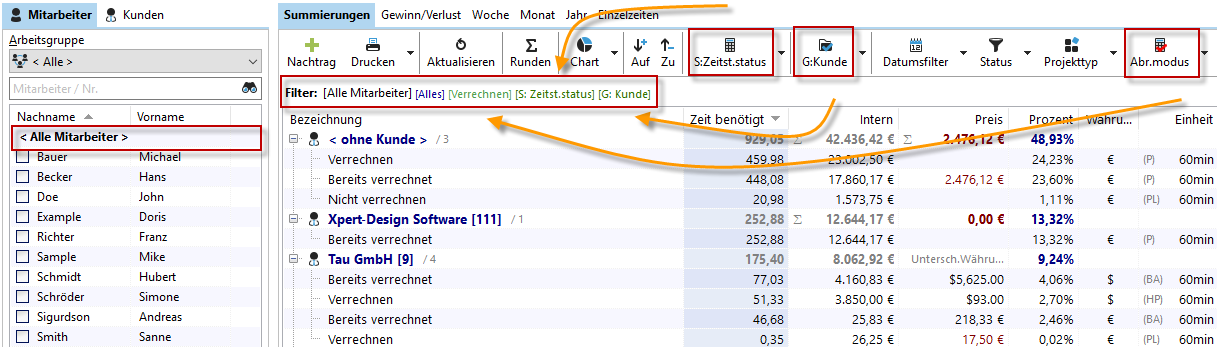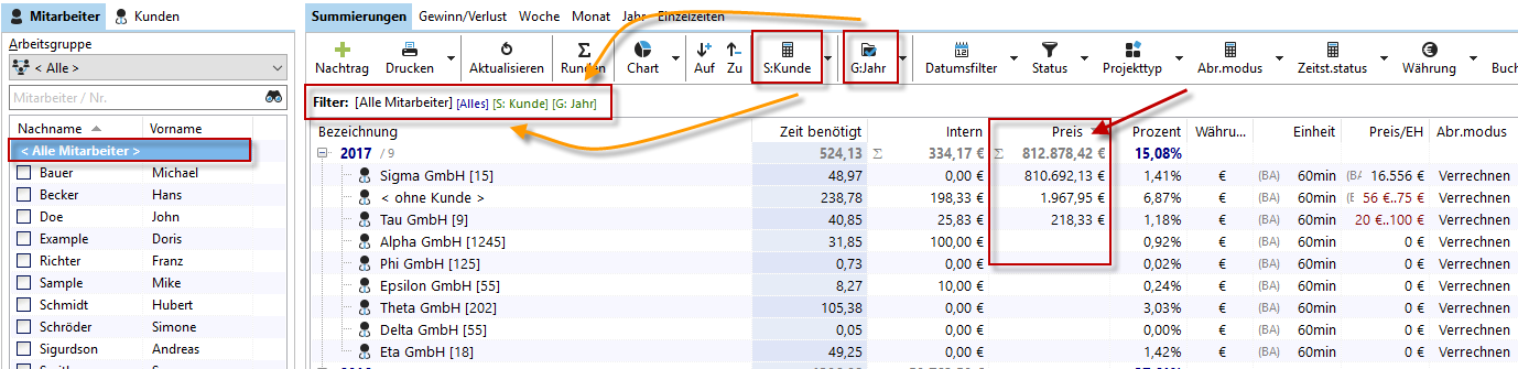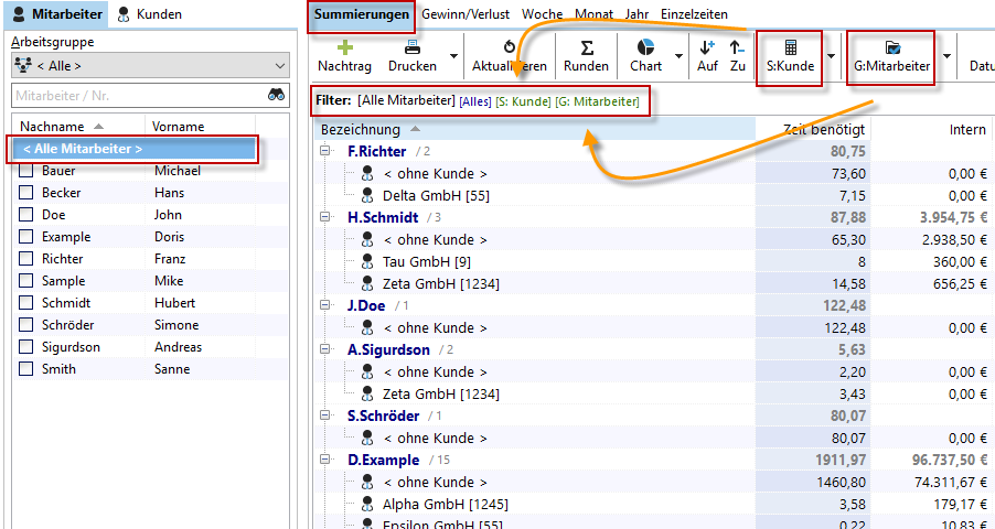 Eine Übersicht über die Kunden, an denen Ihre Mitarbeiter arbeiten, erhalten Sie, wenn Sie die Summierung auf "Kunde" und die Gruppierung auf "Mitarbeiter" setzen.