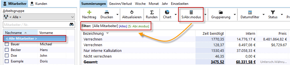 Einen Überblick über die Projektzeiten, die in die unterschiedlichen Projektabrechnungsmodi fließen, erhalten Sie, wenn Sie die Summierung auf "Abrechnungsmodus" setzen. Im Beispiel haben wir über alle Mitarbeiter gefiltert.